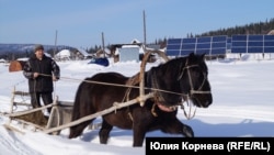 Спускаемся к реке Лебедь. Мимо солнечных батарей – двумя санями, запряженными лошадьми, проложен трафик. Одни сани идут пустыми и как раз на реку. Геннадий Барбачаков приглашает отвезти к проруби, чтобы показать, какая сейчас в Лебеде бежит мутная вода. В верховьях, по словам местных жителей, моют золото приезжие бизнесмены. Теперь из Лебедя воду приходиться отстаивать и кипятить.